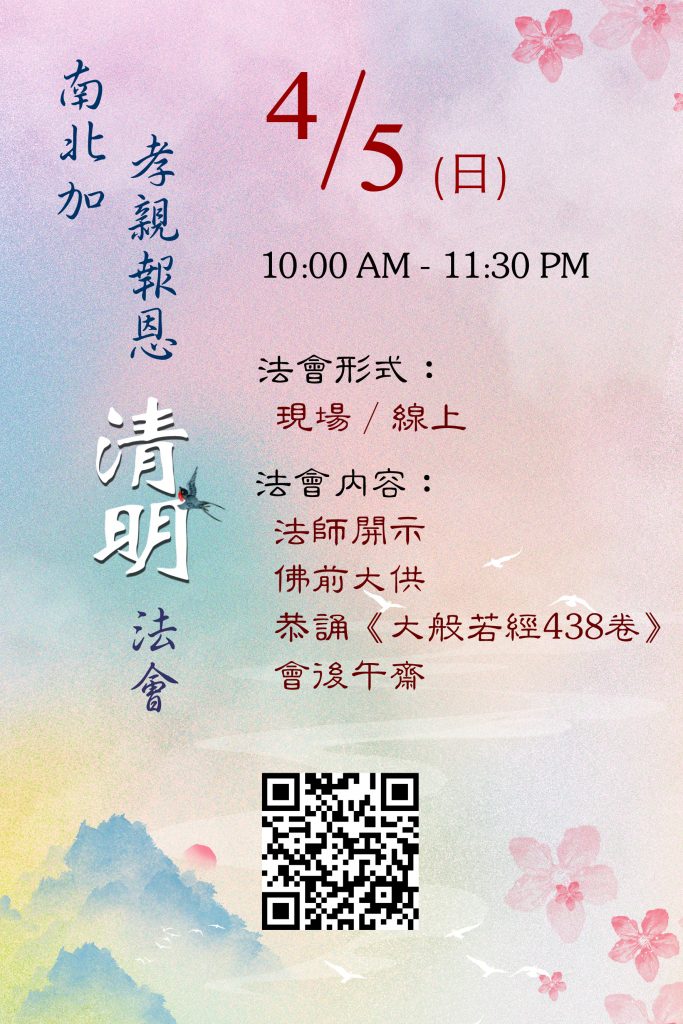 清明時節,慎終追遠。為報歷代祖先及父母深恩,南北加福智特此舉辦孝親報恩清明法會,誠邀您攜家帶眷共同參與,做廣大供養、恭聽法師開示及恭誦《般若經》,以此殊勝功德迴向先亡離苦得樂,往生淨土,祈願現世親眷平安,福慧增長。