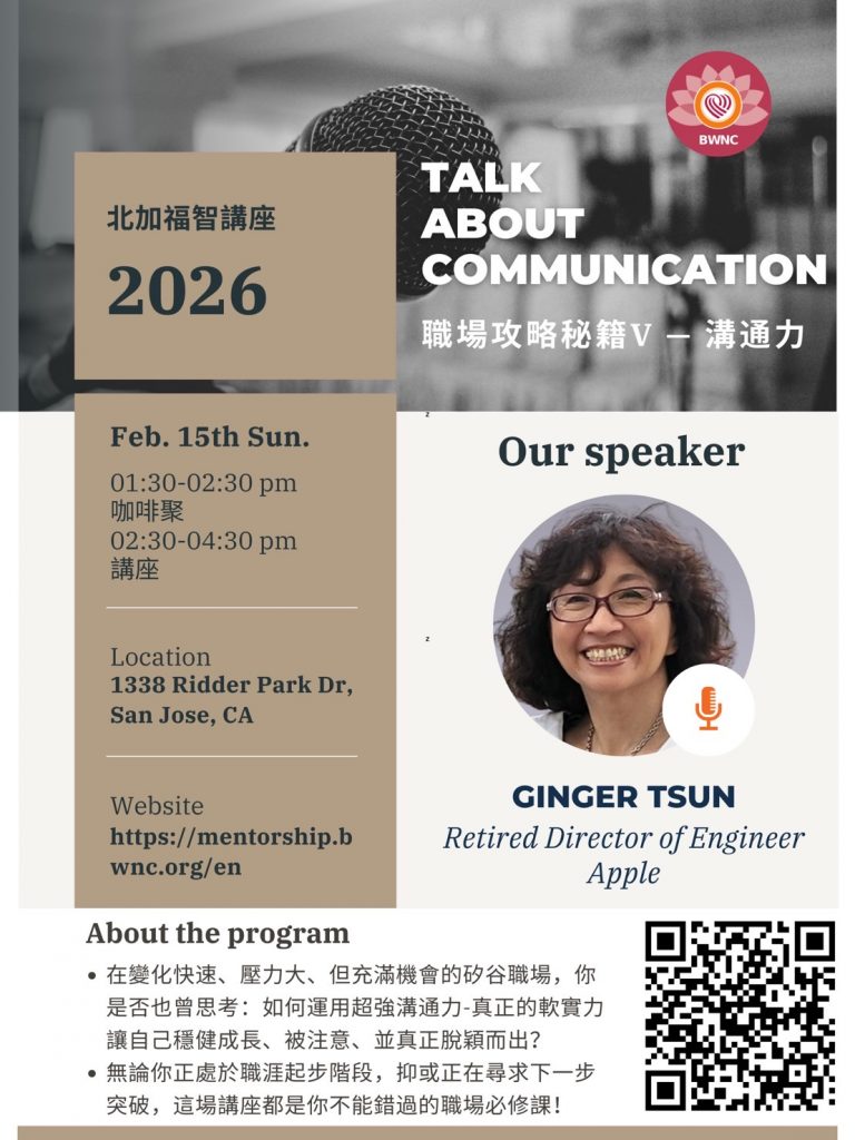 我们再次隆重邀請邀請到Ginger Tsun 女士 — 曾任 Yahoo、Apple 等矽谷頂尖企業高階主管,以輕鬆幽默、深入淺出的方式分享她 30+ 年職場實戰經驗與成功心法。她幫助過上千人,是灣區各界經常邀請的金牌講師🎖️,講座全程笑聲不斷、實用滿滿,結束後更常有學員久久不願離開、繼續交流。